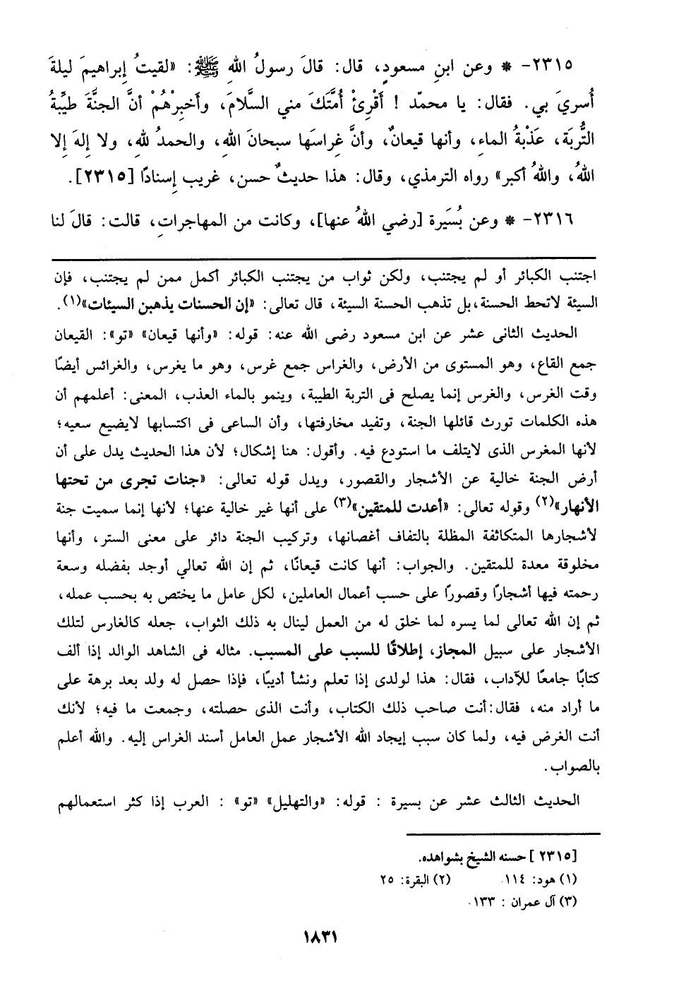 2315 - وعن ابن مسعود، قال: قال رسول الله صلى الله عليه وسلم: ((لقيت إبراهيم ليلة أسري بي. فقال: يا محمد! أقرئ أمتك مني السلام، وأخبرهم أن الجنة طيبة التربة، عذبة الماء، وأنها قيعان، وأن غراسها سبحان الله، والحمدلله، ولا إله إلا الله، والله أكبر)) رواه الترمذي، وقال: هذا حديث حسن، غريب إسنادا. [2315]