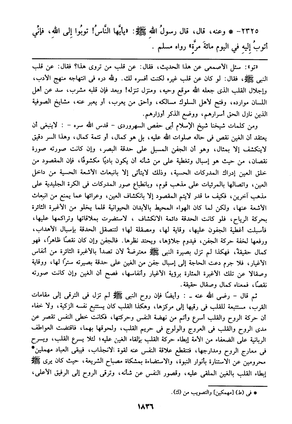 ((تو)):سئل الأصمعي عن هذا الحديث، فقال: عن قلب من تروى هذا؟ فقال: عن قلب النبي صلى الله عليه وسلم، فقال: لو كان عن قلب غيره لكنت أفسره لك. ولله دره في انتهاجه في منهج الأدب، وإجلال القلب الذي جعله الله موقع وحيه، ومنزل تنزله! وبعد فإن قلبه مشرب، سد عن أهل اللسان موارده، وفتح لأهل السلوك مسالكه، وأحق من يعرب، أو يعبر عنه، مشايخ الصوفية الذين نازل الحق أسرارهم، ووضع الذكر أوزارهم.