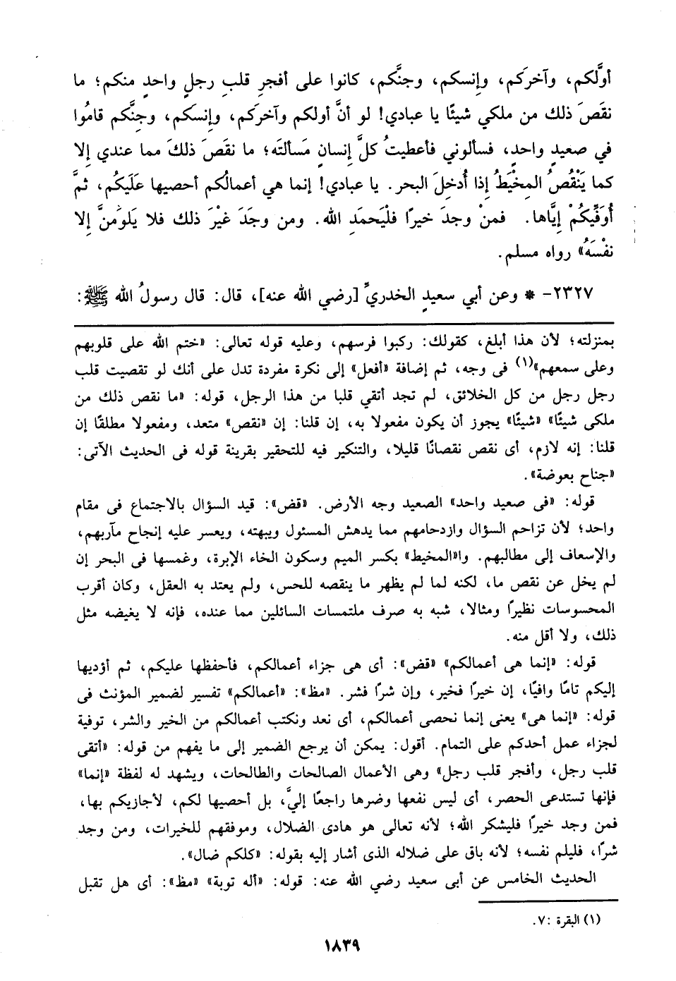 أولكم، وآخركم، وإنسكم، وجنكم، كانوا علي أفجر قلب رجل واحد منكم؛ ما نقص ذلك من ملكي شيئا يا عبادي! لو أن أولكم وآخركم، وإنسكم، وجنكم قاموا في صعيد واحد، فسألوني فأعطيت كل إنسان مسألته؛ ما نقص ذلك مما عندي إلا كما ينقص المخيط إذا أدخل البحر. يا عبادي! إنما هي أعمالكم أحصيها عليكم، ثم أوفيكم إياها. فمن وجد خير فليحمد الله. ومن وجد غير ذلك فلا يلومن إلا نفسه)) رواه مسلم.