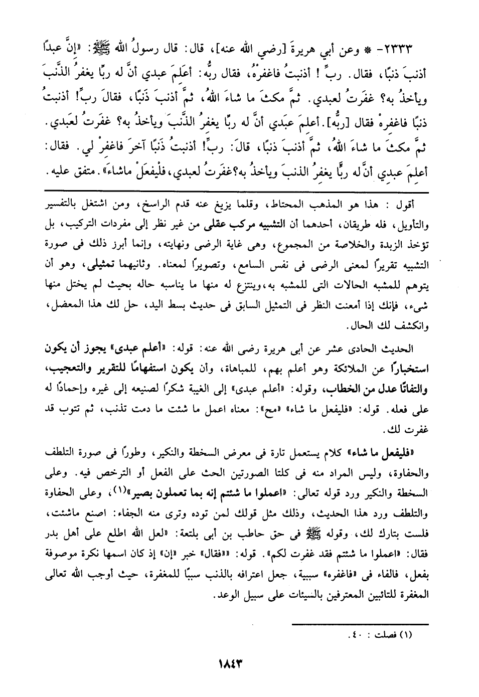 الحديث الحادي عشر عن أبي هريرة رضي الله عنه: قوله: ((أعلم عبدي)) يجوز أن يكون استخبارا عن الملائكة وهو أعلم بهم، للمباهاة، وأن يكون استفهاما للتقرير والتعجيب، والتفاتا عدل من الخطاب، وقوله: ((أعلم عبدي)) إلي الغيبة شكرا لصنيعه إلي غيره وإحمادا له علي فعله. قوله: ((فليفعل ما شاء)) ((مح)):معناه اعمل ما شئت ما دمت تذنب، ثم تتوب فقد غفرت لك.