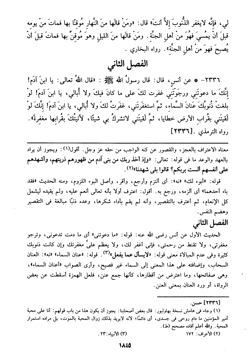 2336 - عن أنس، قال: قال رسول الله صلى الله عليه وسلم: ((قال الله تعالي: يا ابن آدم! إنك ما دعوتني ورجوتني غفرت لك علي ما كان فيك ولا أبالي، يا ابن آدم! لو بلغت ذنوبك عنان السماء، ثم استغفرتني، غفرت لك ولا أبالي، يا ابن آدم! إنك لو لقيتني بقراب الأرض خطايا، ثم لقيتني لا تشرك بي شيئا، لأتيتك بقرابها مغفرة)) رواه الترمذي. [2336]