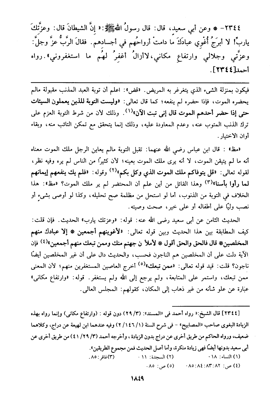 2344 - وعن أبي سعيد، قال: قال رسول الله صلى الله عليه وسلم: ((إن الشيطان قال: وعزتك يا رب! لا أبرج أغوي عبادك ما دامت أرواحهم في أجسادهم. فقال الرب عز وجل: وعزتي وجلالي وارتفاع مكإني، لا أزال أغفر لهم ما استغفروني)) رواه أحمد. [2344]