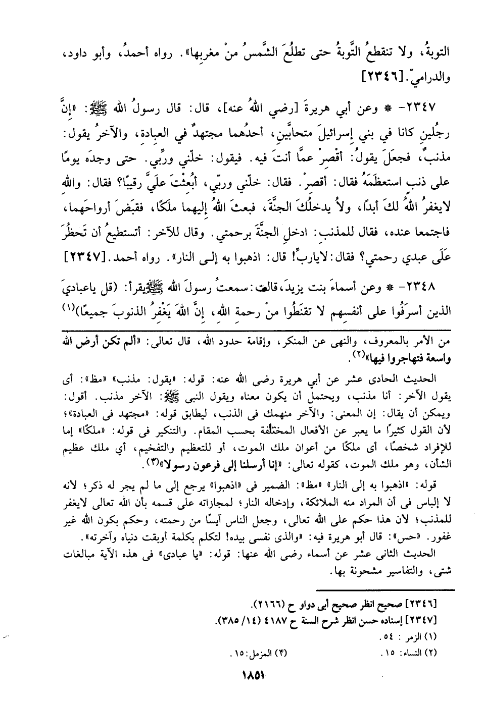 2348 - وعن أسماء بنت يزيد، قال: سمعت رسول الله صلى الله عليه وسلم يقرأ:} قل يا عبادي الذين أسرفوا علي أنفسهم لا تقنطوا من رحمة الله، إن الله يغفر الذنوب جميعا {