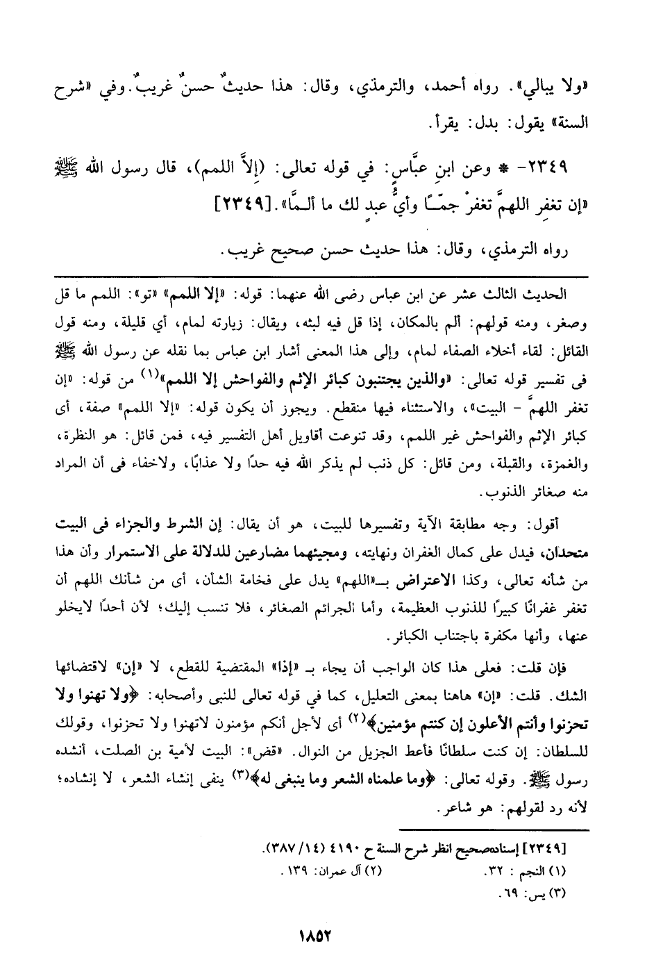 2349 - وعن ابن عباس: في قوله تعالي:} إلا اللمم {،قال رسول الله صلى الله عليه وسلم ((إن تغفر اللهم تغفر جما وأي عبد لك ما ألما)). [2349]