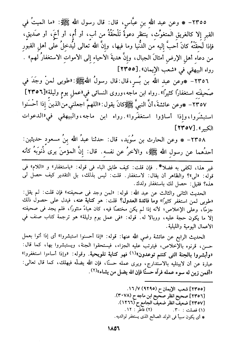 2356 - وعن عبد الله بن بسر، قال: قال رسول الله صلى الله عليه وسلم: ((طوبى لمن وجد في صحيفته استغفارا كثيرا)). رواه ابن ماجه، وروى النسائي في ((عمل يوم وليلة)) [2356]
