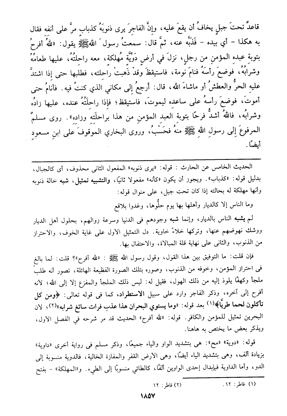 قاعد تحت جبل يخاف أن يقع عليه، وإن الفاجر يرى ذنوبه كذباب مر علي أنفه فقال به هكذا- أي بيده- فذبه عنه، ثم قال: سمعت رسول الله صلى الله عليه وسلم يقول: ((لله أفرح بتوبة عبد مؤمن من رجل، نزل في أرض دوية مهلكة، معه راحلته، عليها طعامه وشرابه، فوضع رأسه فنام نومة، فاستقيظ وقد ذهبت راحلته، فطلبها حتى إذا اشتد عليه الحر والعطش أو ما شاء الله. قال: أرجع إلي مكإني الذي كنت فيه. فأنام حتى أموت، فوضع رأسه علي ساعده ليموت، فاستيقظ؛ فإذا راحلته عنده، عليها زاده وشرابه، فالله أشد فرحا بتوبة العبد المؤمن من هذا براحلته وزاده)) روى مسلم المرفوع إلي رسول الله صلى الله عليه وسلم منه فحسب، وروى البخاري الموقوف علي ابن مسعود أيضا.