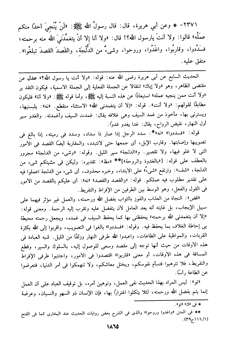 ((قض)):النجاة من العذاب والفوز بالثواب بفضل الله ورحمته، والعمل غير مؤثر فيهما علي سبيل الإيجاب، بل غايته أنه يعد العامل لأن يتفضل عليه وتقرب إليه الرحمة. ومعنى قوله: ((إلا أن يتغمدني الله برحمته)) يحفظني بها كما يحفظ السيف في غمده، ويجعل رحمته محيطة بي إحاطة الغلاف بما يحفظ فيه. وقوله: ((فسددوا)) بالغوا في التصويب، واقربوا إلي الله بكثرة القربات، والمواظبة علي الطاعات، واعبدوا الله طرفي النهار وزلفا من الليل. شبه العبادة في هذه الأوقات من حيث أنها توجه إلي مقصد وسعى للوصول إليه، بالسلوك والسير، وقطع المسافة في هذه الأوقات، أو معنى ((قاربوا)) اقتصدوا في الأمور، واجتنبوا طرفي الإفراط والتفريط، فلا تترهبوا فتسأم نفوسكم، ويختل معاشكم، ولا تنهمكوا في أمر الدنيا، فتعرضوا عن الطاعة رأسا.