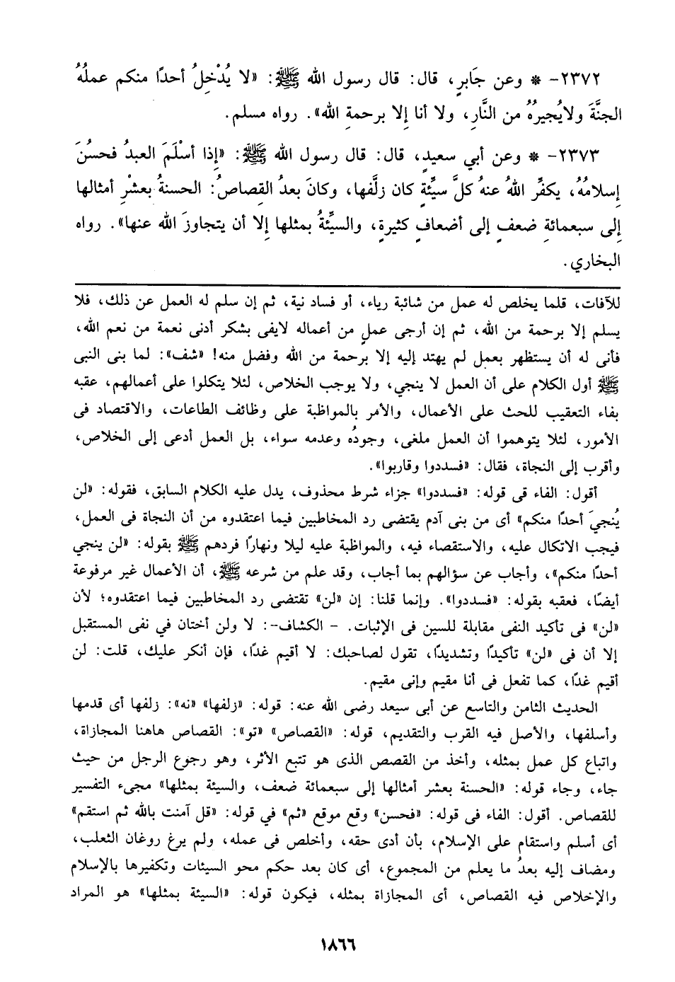 أقول الفاء في قوله: ((فسددوا)) جزاء شرط محذوف، يدل عليه الكلام السابق، فقوله: ((لن ينجي أحد منكم)) أي من بني آدم يقتضي رد المخاطبين فيما اعتقدوه من أن النجاة في العمل، فيجب الاتكال عليه، والاستقصاء فيه، والمواظبة عليه ليلا ونهارا فردهم صلى الله عليه وسلم بقوله: ((لن ينجي أحد منكم))،وأجاب عن سؤالهم بما أجاب، وقد علم من شرعه صلى الله عليه وسلم، أن الأعمال غير مرفوعة أيضا، فعقبه بقوله: ((فسددوا)).وإنما قلنا: إن ((لن)) تقتضي رد المخاطبين فيما اعتقدوه؛ لأن ((لن)) تأكيدا وتشديدا، تقول لصاحبك: لا أقيم غدا، فإن أنكر عليك، قلت: لن أقيم غدا، كما تفعل في إني مقيم وإني مقيم.