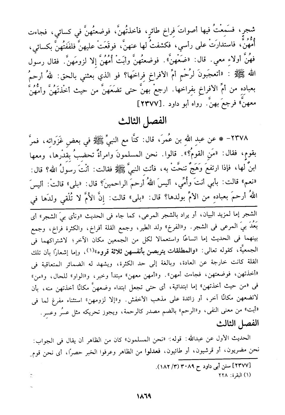 2378 - عن عبد الله بن عمر، قال: كنا مع النبي صلى الله عليه وسلم في بعض غزواته، فمر بقوم، فقال: ((من القوم؟)).قالوا: نحن المسلمون وامرأة تحضب بقدرها، ومعها ابن لها، فإذا ارتفع وهج تنحت به، فأتت النبي صلى الله عليه وسلم فقالت: أنت رسول الله؟ قال: ((نعم)) قالت: بأبي أنت وأمي، أليس الله أرحم الراحمين؟ قال: ((بلي)) قالت: أليس الله أرحم بعباده من الأم بولدها؟ قال: ((بلي)) قالت: إن الأم لا تلقي ولدها في