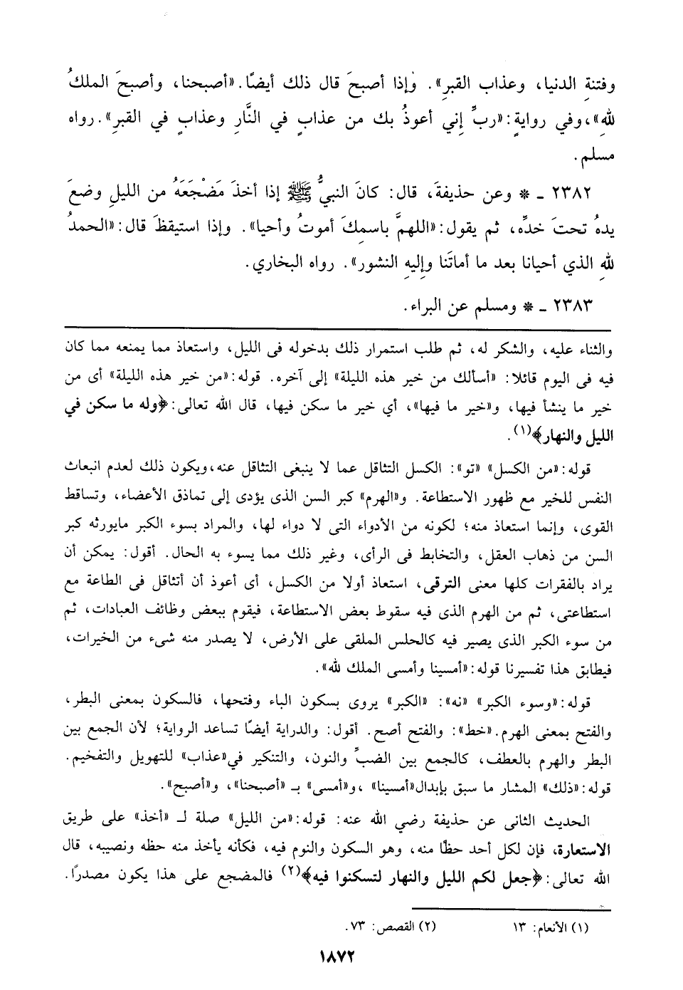 2382 - وعن حذيفة، قال: كان النبي صلى الله عليه وسلم إذا أخذ مضجعه من الليل وضع يده تحت خده، ثم يقول: ((اللهم باسمك أموت وأحيا)).وإذا استيقظ قال: ((الحمدلله الذي أحيانا بعد ما أماتنا وإليه النشور)) رواه البخاري.