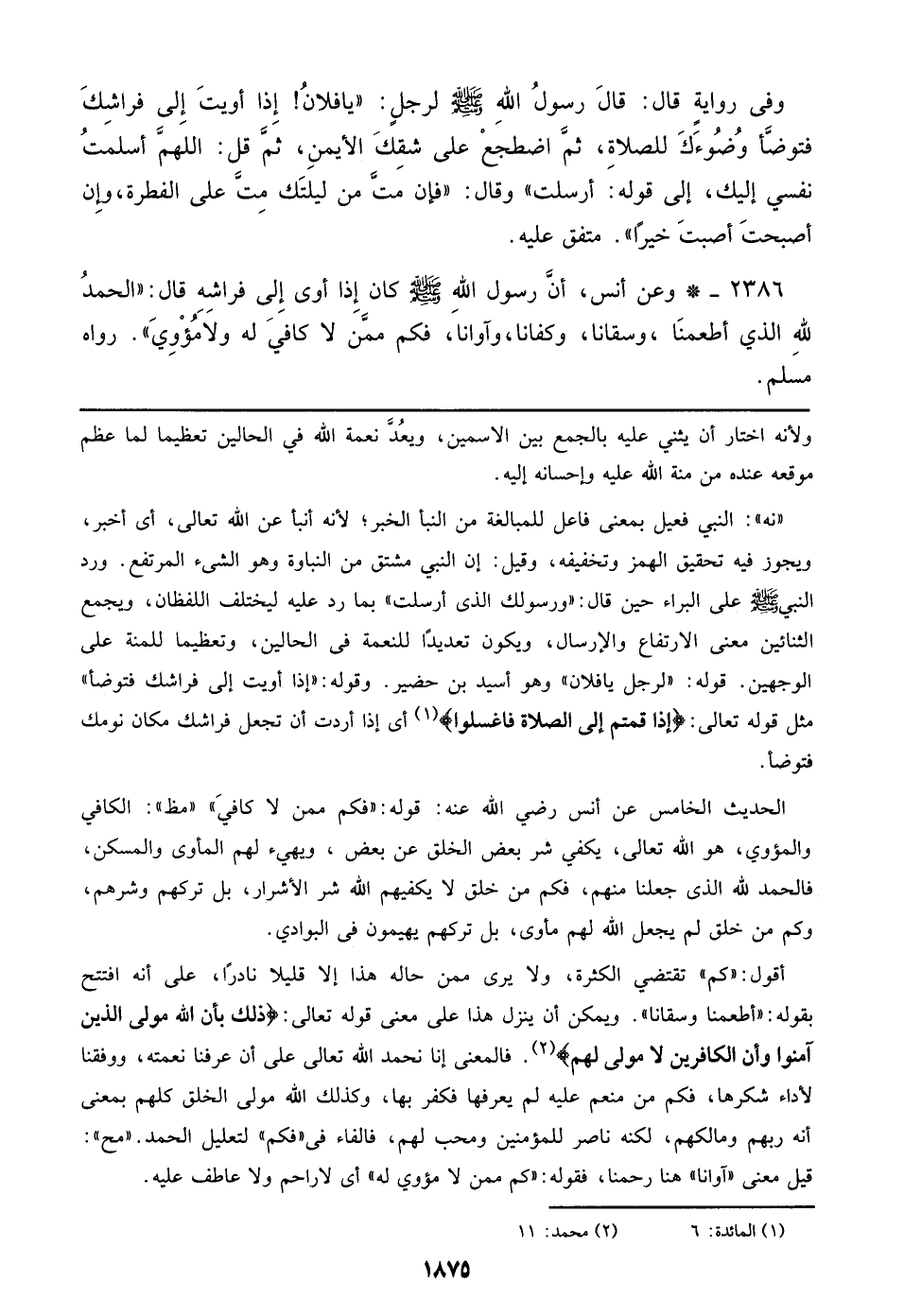 2386 - وعن أنس، أن رسول الله صلى الله عليه وسلم كان إذا أوى إلي فراشه قال: ((الحمدلله الذي أطعمنا، وسقانا، وكفانا، وآوانا، فكم ممن لا كافي له ولا مؤوي)).رواه مسلم.