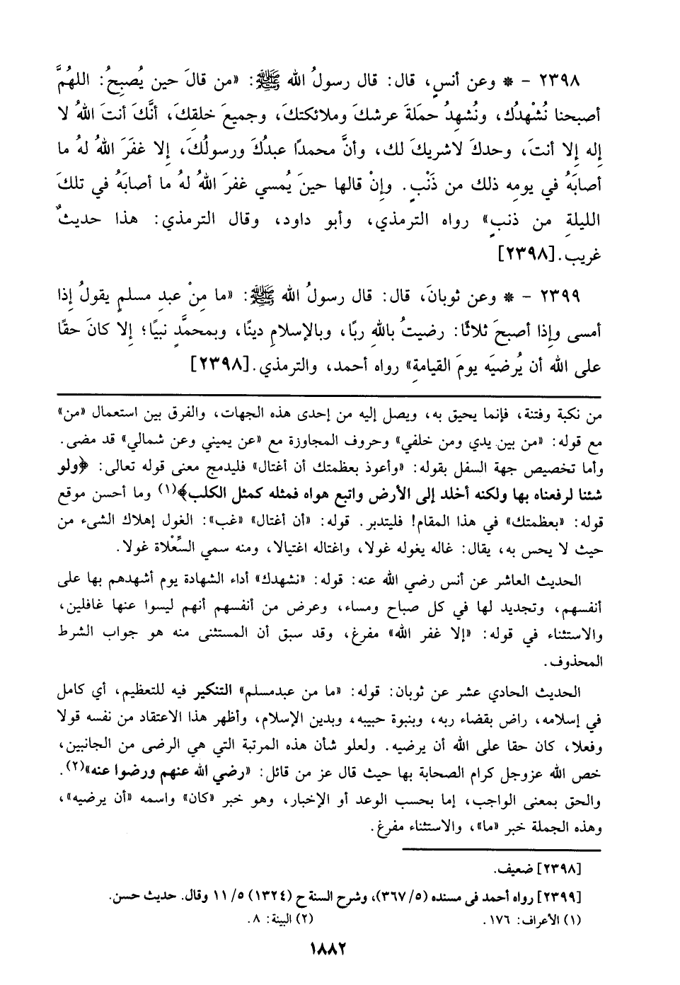 2398 - وعن أنس، قال: قال رسول الله صلى الله عليه وسلم: ((من قال حين يصبح: اللهم أصبحنا نشهدك، ونشهد حملة عرشك وملائكتك، وجميع خلقك، أنك أنت الله لا إله إلا أنت، وحدك لا شريك لك، وأن محمدا عبدك ورسولك، إلا غفر الله له ما أصابه من يومه ذلك من ذنب. وإن قالها حين يمسي غفر الله له ما أصابه في تلك الليلة من ذنب)) رواه الترمذي، وأبو داود، وقال الترمذي: هذا حديث غريب. [2398]