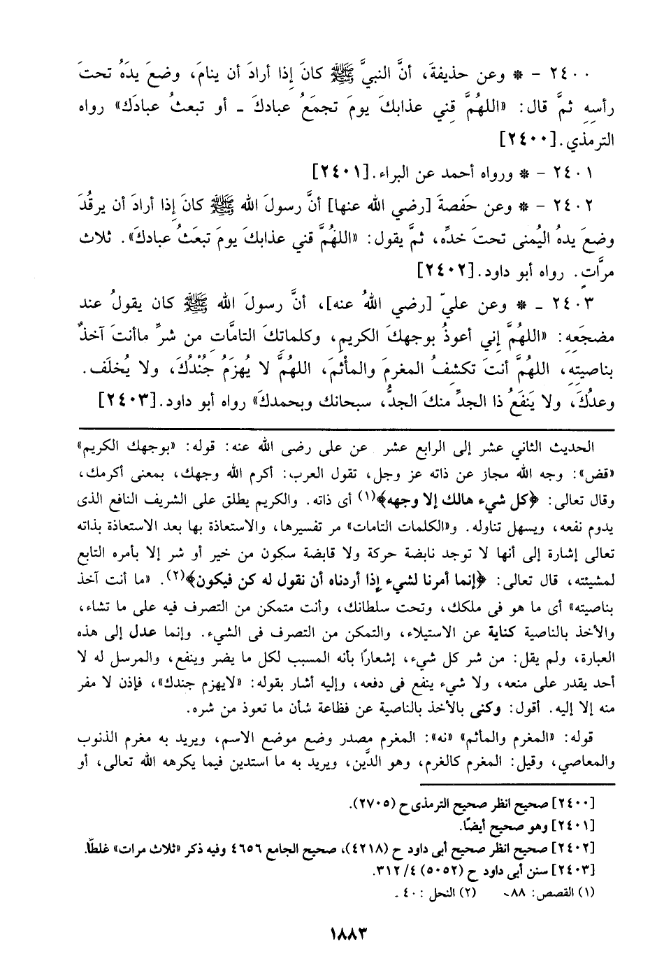 2400 - وعن حذيفة، أن النبي صلى الله عليه وسلم كان إذا أراد أن ينام، وضع يده تحت رأسه ثم قال: ((اللهم قني عذابك يوم تجمع عبادك- أو تبعث عبادك)) رواه الترمذي. [2400]
