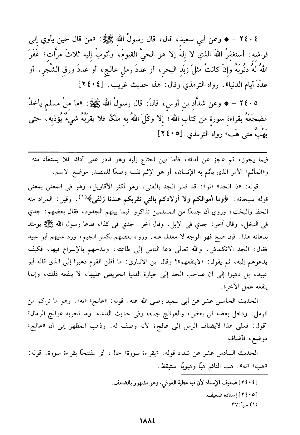 2404 - وعن أبي سعيد، قال، قال رسول الله صلى الله عليه وسلم: ((من قال حين يأوي إلي فراشه: أستغفر الله الذي لا إله إلا هو الحي القيوم، وأتوب إليه ثلاث مرات؛ غفر الله له ذنوبه وإن كانت مثل زبد البحر، أو عدد رمل عالج، أو عدد أوراق الشجر، أو عدد أيام الدنيا)) رواه الترمذي وقال: حديث غريب. [2404]