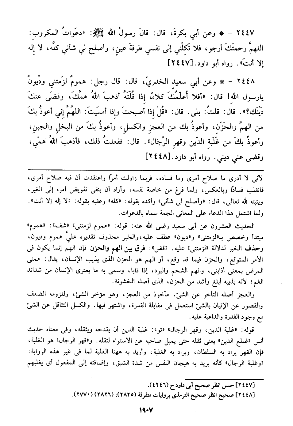 2448 - وعن أبي سعيد الخدري، قال: قال رجل: همومٌ لزمتني وديونٌ يا رسول الله! قال: ((أفلا أعلمك كلاماً إذا قلته أذهب الله همك، وقضى عنك دينك؟)). قال: قلت: بلي. قال: ((قل إذا أصبحت وإذا أمسيت: اللهم إني أعوذ بك من الهم والحزن، وأعوذ بك من العجز والكسل، وأعوذ بك من البخل والجبن، وأعوذ بك من غلبة الدين وقهر الرجال)). قال: ففعلت ذلك، فأذهب الله همي، وقضى عن ديني. رواه أبو داود. [2448]