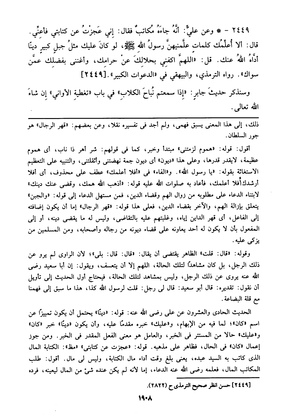 2449 - وعن علي: أنه جاءه مُكاتب فقال: إني عجزت عن كتابتي فأعني. قال: ألا أعلمك كلمات علمنيهن رسول الله صلى الله عليه وسلم، لو كان عليك مثل جبل كبير ديناً أداه الله عنك. قل: ((اللهم اكفني
