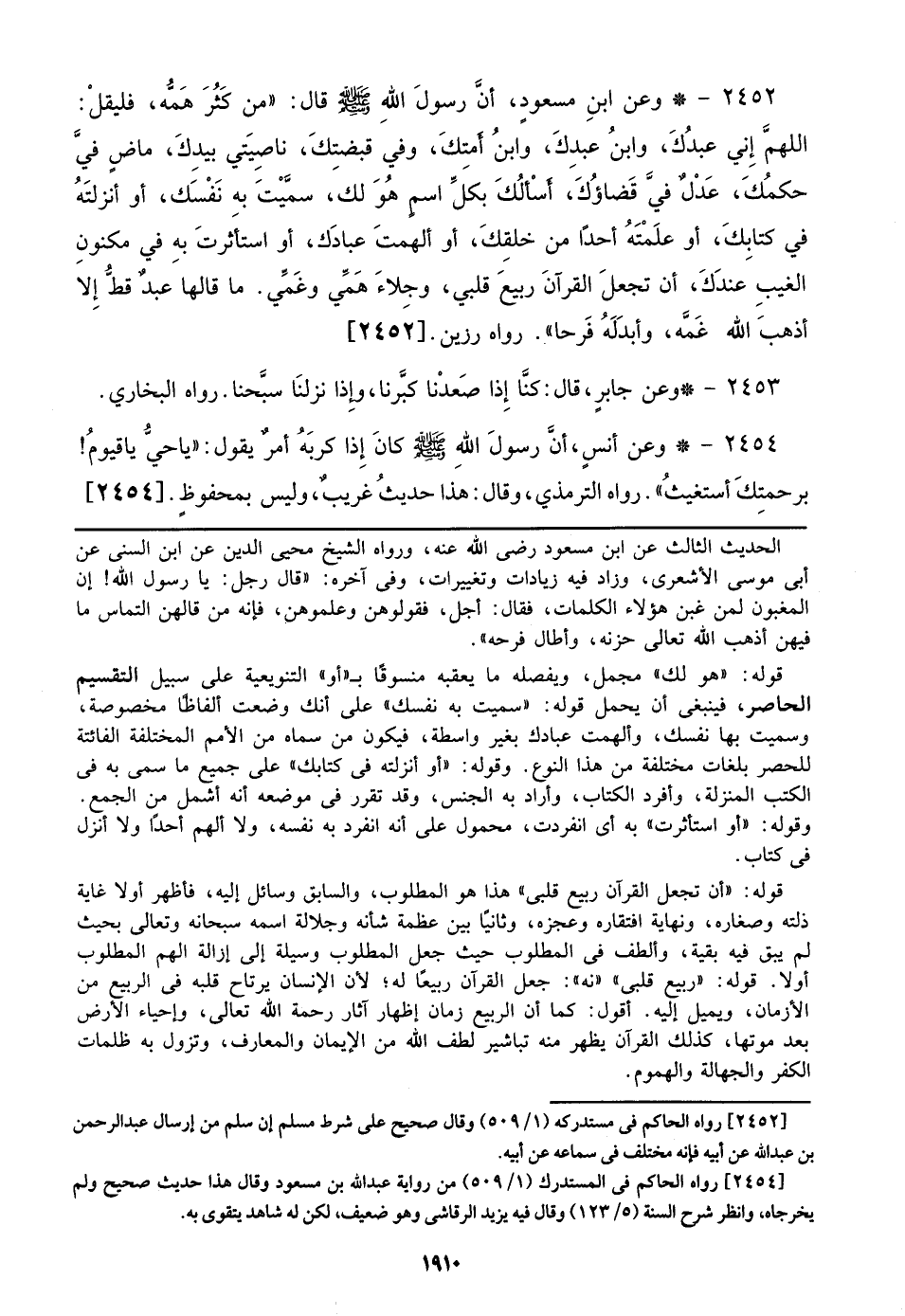 2452 - وعن ابن مسعود، أن رسول الله صلى الله عليه وسلم قال: ((من كثر همه، فليقل: اللهم إني عبدك، وابن عبدك، وابن أمتك، وفي قبضتك، ناصيتي بيدك، ماضٍ فيَّ حكمك، عدل فيَّ قضاؤك، أسألك بكل اسم هو لك، سميت به نفسك، أو أنزلته في كتابك، أو علمته أحداً من خلقك، أو ألهمت عبادك، أو استأثرت به في مكنون الغيب عندك، أن تجعل القرآن ربيع قلبي، وجلاء همي وغمي. ما قالها عبدٌ قط إلا أذهب الله غمه، وأبدله فرحاً)). رواه رزين. [2452]