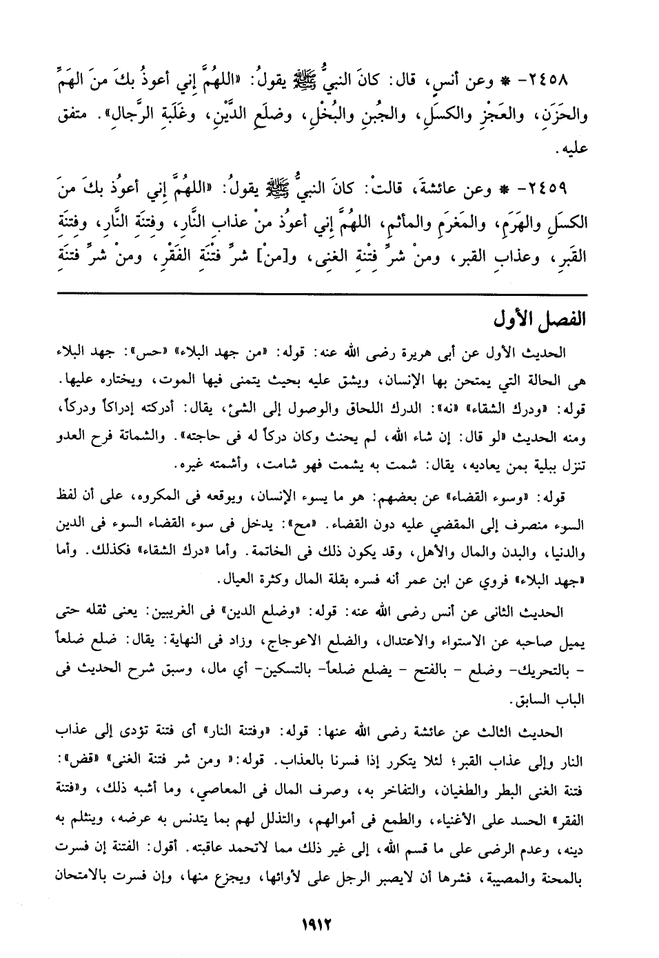 الحديث الأول عن أبي هريرة رضي الله عنه: قوله: ((من جهد البلاء)) ((حس)): جهد البلاء هي الحالة التي يمتحن بها الإنسان، ويشق عليه بحيث يتمنى فيها الموت، ويختاره عليها. قوله: ((ودرك الشقاء)) ((نه)): الدرك اللحاق والوصول إلي الشيء، يقال أدركته إدراكاً ودركاً، ومنه الحديث ((لو قال: إن شاء الله، لم يحنث وكان دركاً له في حاجته)). والشماتة فرح العدو تنزل ببلية بمن يعاديه، يقال: شمت به يشمت فهو شامت، وأشمته غيره.