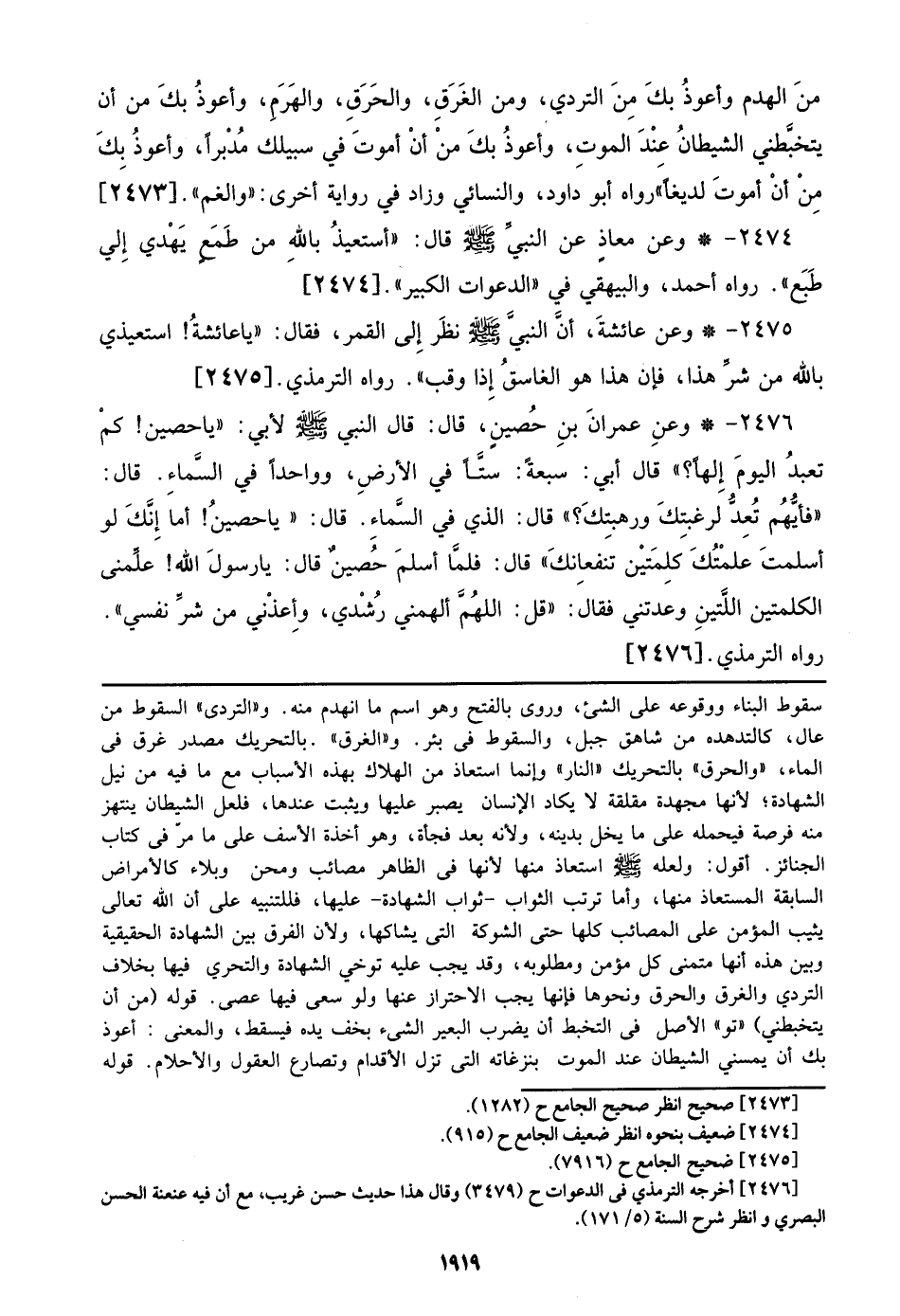 من الهدم وأعوذ بك من التردي، ومن الغرق، والحرق، والهرم، وأعوذ بك من أن يتخبطني الشيطان عند الموت، وأعوذ بك من أن أموت في سبيلك مدبراً، وأعوذ بك من أن أموت لديغاً)) رواه أبو داود، والنسائي وزاد في رواية أخرى: ((والغم)). [2473]