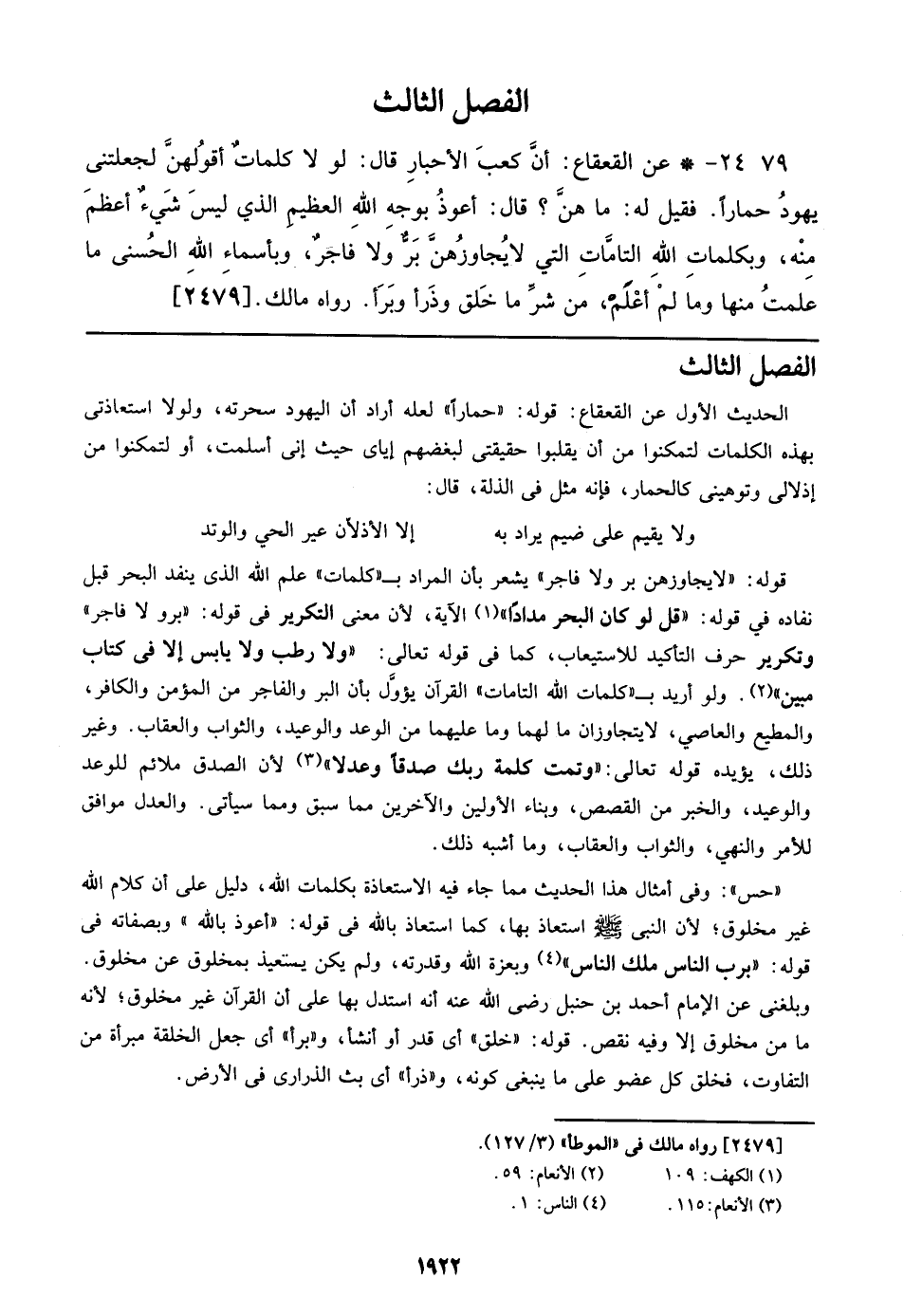قوله: ((لا يجاوزهن بر ولا فاجر)) يشعر بأن المراد بـ ((كلمات)) علم الله الذي ينفد البحر قبل نفاده في قوله: {قل لو كان البحر مداداً} الآية، لأن معنى التكرير في قوله: ((بر ولا فاجر)) وتكرير حرف التأكيد للاستيعاب، كما في قوله تعالي: {ولا رطب ولا يابس إلا في كتاب مبين}. ولو أريد بـ ((كلمات الله التامات)) القرآن يؤول بأن البر والفاجر من المؤمن والكافر، والمطيع والعاصي، لا يتجاوزان ما لهما وما عليهما من الوعد والوعيد، والثواب والعقاب. وغير ذلك، يؤيده قوله تعالي: {وتمت كلمة ربك صدقاً وعدلاً} لأن الصدق ملائم للوعد والوعيد، والخبر من القصص، وبناء الأولين والآخرين مما سبق ومما سيأتي. والعدل موافق للأمر والنهي، والثواب والعقاب، وما أشبه ذلك.