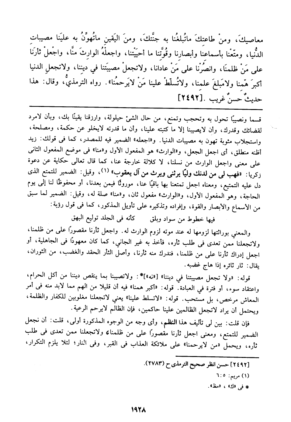 والمعني بوراثتها لزومها له عند موته لزوم الوارث له. واجعل ثأرنا مقصوراً علي من ظلمنا، ولا تجعلنا ممن تعدى في طلب ثأره، فأخذ به غير الجإني، كما كان معهوداً في الجاهلية، أو اجعل إدراك ثأرنا علي من ظلمنا، فندرك منه ثأرنا، وأصل الثأر الحقد والغضب، من الثوران، يقال: ثار ثائره إذا هاج غضبه.