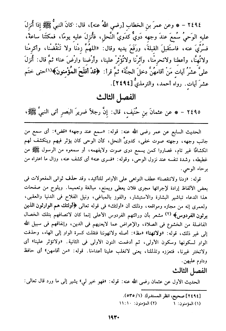 2494 - وعن عمر بن الخطاب [رضي الله عنه]، قال: كان النبي صلى الله عليه وسلم إذا أنزل عليه الوحي سمع عند وجهه دويٌ كدوي النحل، فأنزل عليه يوماً، فمكثنا ساعةً، فسري عنه، فاستقبل القبلة، ورفع يديه وقال: ((اللهم زدنا ولا تنقضنا، وأكرمنا ولا تهنا، وأعطنا ولا تحرمنا، وآثرنا ولا تؤثر علينا، وأرضنا وارض عنا)). ثم قال: أنزل علي عشر آيات من أقامهن دخل الجنة)) ثم قرأ: {قد أفلح المؤمنون} حتى ختم عشر آيات. رواه أحمد، والترمذي [2494].
