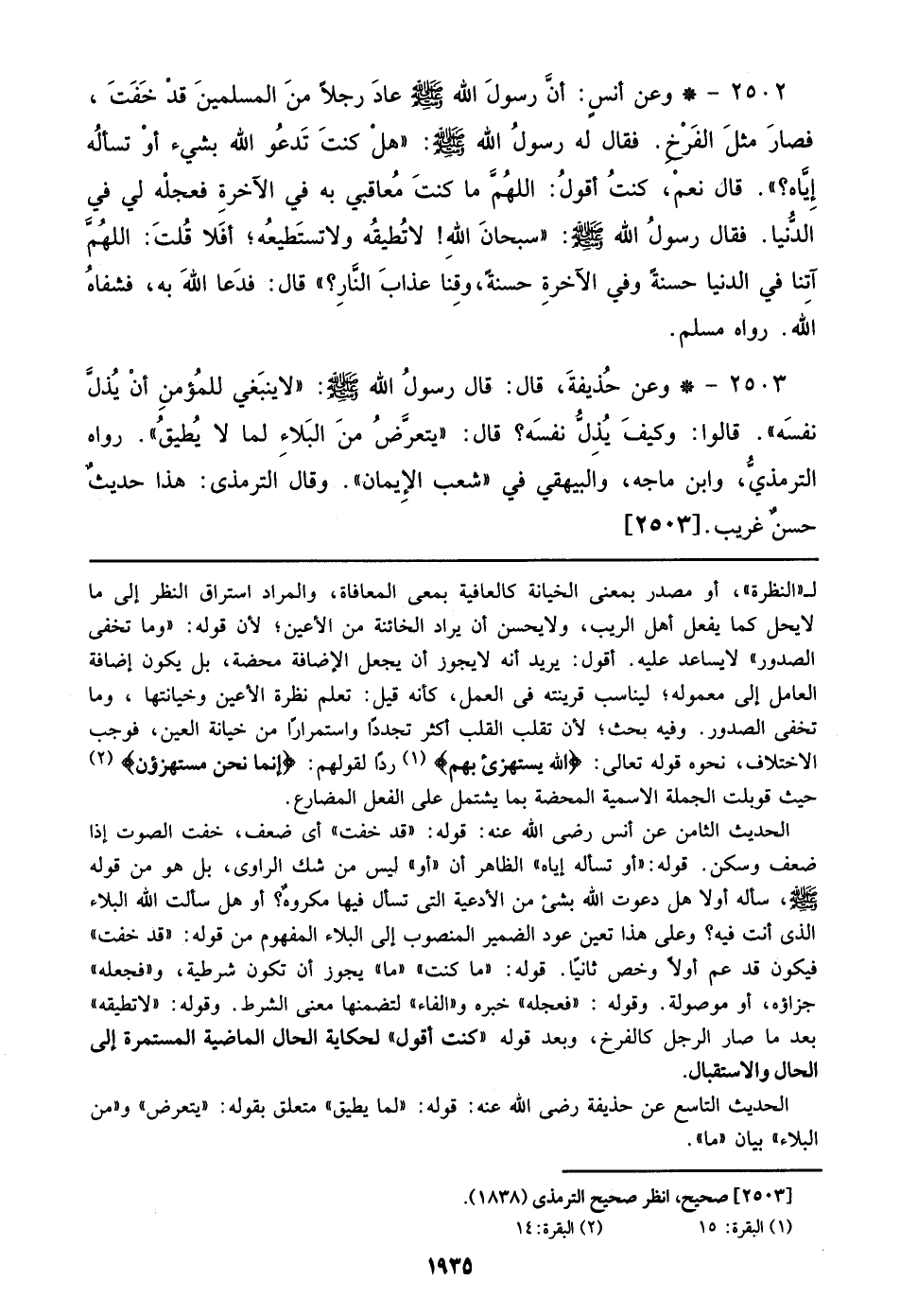 2502 - وعن أنس: أن رسول الله صلى الله عليه وسلم عاد رجلاً من المسلمين قد خفت، فصار مثل الفرخ. فقال له رسول الله صلى الله عليه وسلم: ((هل كنت تدعو الله بشيء أو تسأله إياه؟)). قال: نعم، كنت أقول: اللهم ما كنت معاقبي به في الآخرة فعجله لي في الدنيا. فقال رسول الله صلى الله عليه وسلم: ((سبحان الله! لا تطيقه ولا تستطيعه؛ أفلا قلت: اللهم آتنا في الدنيا حسنة وفي الآخرة حسنة، وقنا عذاب النار؟)). قال: فدعا الله به، فشفاه الله. رواه مسلم.