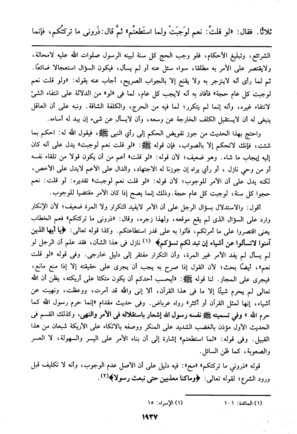أقول: والاستدلال بسؤال الرجل علي أن الأمر لا يفيد التكرار ولا المرة ضعيف؛ لأن الإنكار وارد علي السؤال الذي لم يقع موقعه، ولهذا زجره، وقال: ((ذروني ما تركتكم)) فعم الخطاب يعني اقتصروا علي ما أمرتكم، فأتوا به علي قدر استطاعتكم. وكذا قوله تعالي: {يا أيها الذين آمنوا لا تسألوا عن أشياء إن تبد لكم تسؤكم} نازل في هذا الشأن، فقد علم أن الرجل لو لم يسأل لم يفد الأمر غير المرة، وأن التكرار مفتقر إلي دليل خارجي. وفي قوله ((لو قلت نعم))، أيضاً بحث؛ لأن القول إذا صرح به يجب أن يجري علي حقيقته إلا إذا منع مانع، فيجري علي المجاز. لنا قوله صلى الله عليه وسلم: ((أيحسب أحدكم أن يكون متكئاً علي أريكته، يظن أن الله تعالي لم يحرم شيئاً إلا ما في هذا القرآن، ألا إني والله قد أمرت، ووعظت، ونهيت عن أشياء، إنها لمثل القرآن أو أكثر)) رواه عرباض. وفي حديث مقدام ((إنما حرم رسول الله كما حرم الله)) وفي تسميته صلى الله عليه وسلم نفسه رسول الله إشعار باستقلاله في الأمر والنهي، وكذلك القسم في الحديث الأول مؤذن بالغضب الشديد علي المنكر ووصفه بالاتكاء علي الأريكة شبعان من هذا القبيل. وفي قوله: ((لما استطعتم)) إشارة إلي أن بناء الأمر علي اليسر والسهولة، لا العسر والصعوبة، كما ظن السائل.