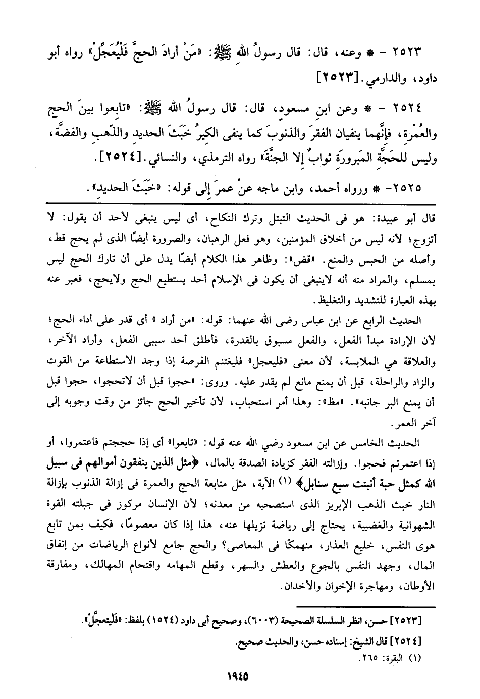 2523 - وعنه، قال: قال رسول الله صلى الله عليه وسلم: ((من أراد الحج فليعجل)). رواه أبو داود، والدارمي. [2523]