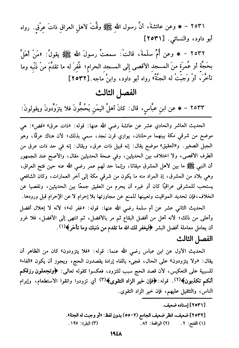 2531 - وعن عائشة، أن رسول الله صلى الله عليه وسلم وقت لأهل العراق ذات عرق. رواه أبو داود، والنسائي. [2531]