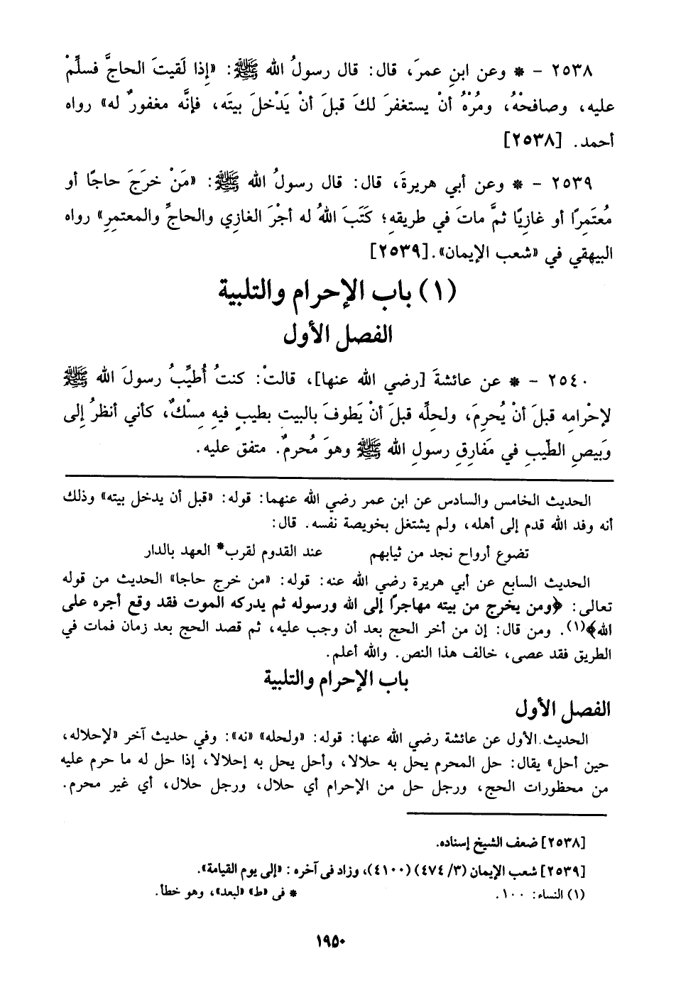 2538 - وعن ابن عمر، قال: قال رسول الله صلى الله عليه وسلم: ((إذا لقيت الحاج فسلم عليه، وصافحه، ومره أن يستغفر لك قبل أن يدخل بيته، فإنه مغفور له)). رواه أحمد. [2538]