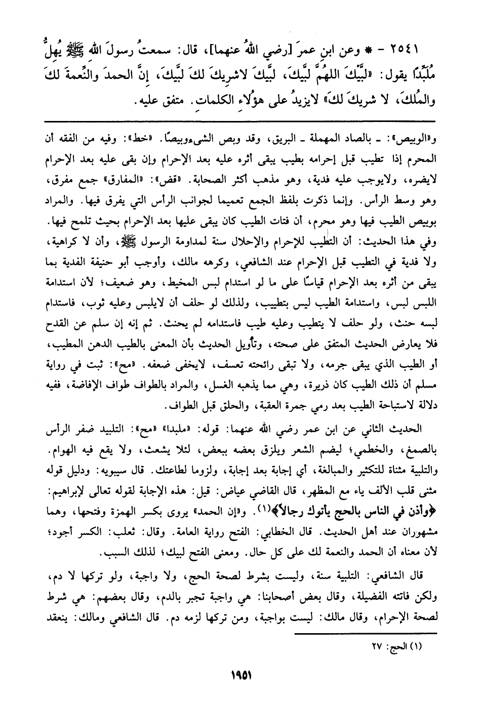الحديث الثاني عن ابن عمر رضي الله عنهما: قوله: ((ملبداً)) ((مح)): التلبيد ضفر الرأس بالصمغ، والخطمي؛ ليضم الشعر ويلزقه بعضه ببعض، لئلا يشعث، ولا يقع فيه الهوام. والتلبية مثناة للتكثير والمبالغة، أي إجابة بعد إجابة، ولزوماً لطاعتك. قال سيبويه: ودليل قوله مثنى قلب الألف ياء مع المظهر، قال القاضي عياض: قيل: هذه الإجابة لقوله تعالي لإبراهيم: {وأذن في الناس بالحج يأتوك رجالاً}. و ((إن الحمد)) يروى بكسر الهمزة وفتحها، وهما مشهوران عند أهل الحديث. قال الخطابي: الفتح رواية العامة. وقال: ثعلب: الكسر أجود؛ لأن معناه أن الحمد والنعمة لك علي كل حال. ومعنى الفتح لبيك؛ لذلك السبب.