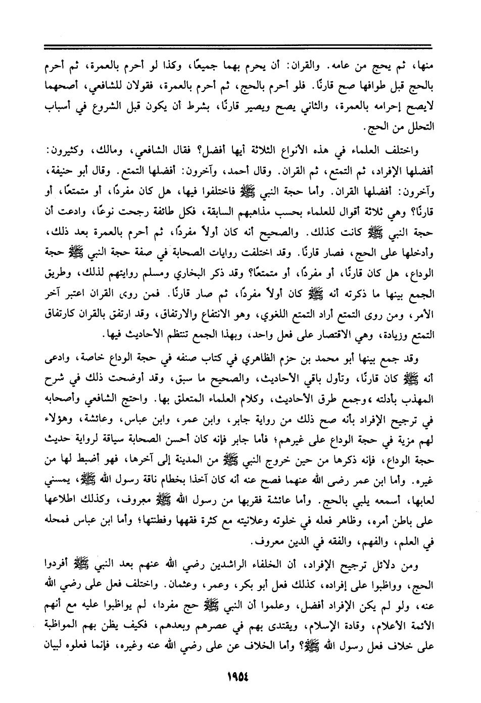 وقد جمع بينها أبو محمد بن حزم الظاهري في كتاب صنفه في حجة الوداع خاصة، وادعى أنه صلى الله عليه وسلم كان قارناً، وتأول باقي الأحاديث، والصحيح ما سبق، وقد أوضحت ذلك في شرح المهذب بأدلته، وجمع طرق الأحاديث، وكلام العلماء المتعلق بها. واحتج الشافعي وأصحابه في ترجيح الإفراد بأنه صح ذلك من رواية جابر، وابن عمر، وابن عباس، وعائشة، وهؤلاء لهم مزية في حجة الوداع علي غيرهم؛ فأما جابر فإنه كان أحسن الصحابة سياقة لرواية حديث حجة الوداع، فإنه ذكرها من حين خروج النبي صلى الله عليه وسلم من المدينة إلي آخرها، فهو أضب لها من غيره. وأما ابن عمر رضي الله عنهما فصح عنه أنه كان آخذاً بخطام ناقة رسول الله صلى الله عليه وسلم، يمسني لعابها، أسمعه يلبي بالحج. وأما عائشة فقربها من رسول الله صلى الله عليه وسلم معروف، وكذلك اطلاعها علي باطن أمره، وظاهر فعله في خلوته وعلإنيته مع كثرة فقهها وفطنتها؛ وأما ابن عباس فمحله في العلم، والفهم، والفقه في الدين معروف.