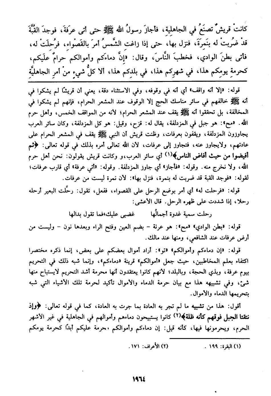 كانت قريش تصنع في الجاهلية، فأجاز رسول الله صلي حتى أتى عرفة، فوجد القبة قد ضربت له بنمرة، فنزل بها حتى إذا زاغت الشمس أمر بالقصواء، فرحلت له، فأتى بطن الوادي، فخطب الناس، وقال: ((إن دماءكم وأموالكم حرام عليكم، كحرمة يومكم هذا، في شهركم هذا، في بلدكم هذا، ألا كل شيء من أمر الجاهلية