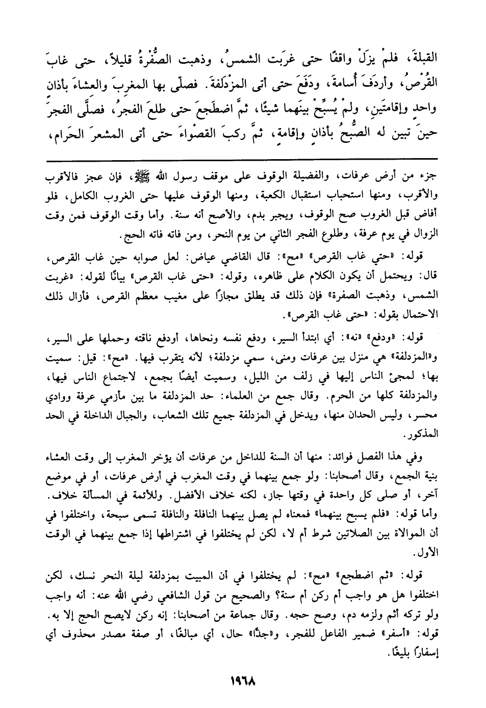 وفي هذا الفصل فوائد: منها أن السنة للداخل من عرفات أن يؤخر المغرب إلي وقت العشاء بنية الجمع، وقال أصحابنا: ولو جمع بينهما في وقت المغرب في أرض عرفات، أو في موضع آخر، أو صلي كل واحدة في وقتها جاز، لكنه خلاف الأفضل. وللأئمة في المسألة خلاف. وأما قوله: ((فلم يسبح بينهما)) فمعناه لم يصل بينهما النافلة والنافلة تسمى سبحة، واختلفوا قي أن الموالاة بين الصلاتين شرط أم لا، لكن لم يختلفوا في اشتراطها إذا جمع بينهما في الوقت الأول.