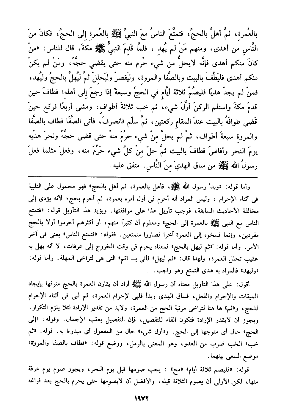 وأما قوله: ((وبدأ رسول الله صلي الله عليه ويلم، فأهل بالعمرة، ثم أهل بالحج)) فهو محمول علي التلبية في أثناء الإحرام، وليس المراد أنه أحرم في أول أمره بعمرة، ثم أحرم بحج؛ لأنه يؤدي إلي مخالفة الأحاديث السابقة، فوجب تأويل هذا علي موافقتها. ويؤيد هذا التأويل قوله: ((فتمتع الناس مع النبي صلى الله عليه وسلم بالعمرة إلي الحج)) ومعلوم أن كثيراً منهم، أو أكثرهم أحرموا أولاً بالحج مفردين، وإنما فسخوه إلي العمرة آخراً فصاروا متمتعين. فقوله: ((فتمتع الناس)) يعني في آخر الأمر. وأما قوله: ((ثم ليهل بالحج)) فمعناه يحرم في وقت الخروج إلي عرفات، لا أنه يهل به عقيب تحلل العمرة، ولهذا قال: ((ثم ليهل)) فأتى بـ ((ثم)) التي هي لتراخي المهلة. وأما قوله: ((وليهد)) فالمراد به هدي التمتع وهو واجب.