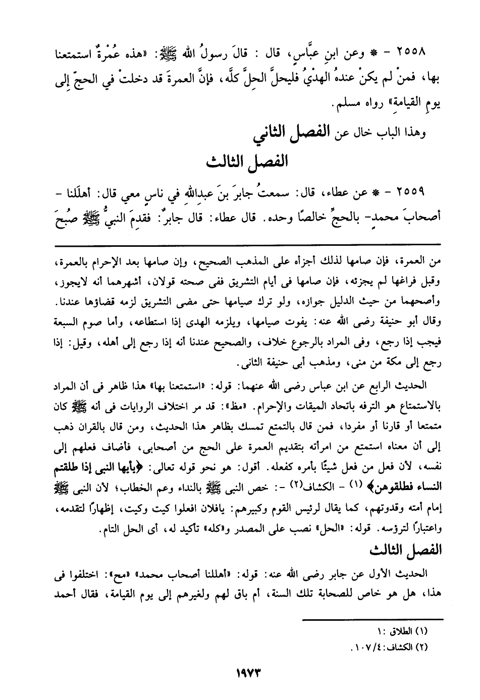 2558 - وعن ابن عباس، قال: قال رسول الله صلى الله عليه وسلم: ((هذه عمرة استمتعنا بها، فمن لم يكن عنده الهدي فليحل الحل كله، فإن العمرة قد دخلت في الحج إلي يوم القيامة)). رواه مسلم.