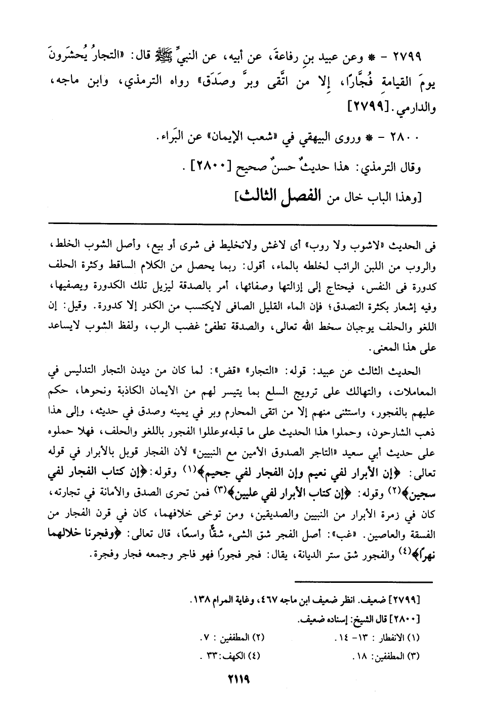 2799 - وعن عبيد بن رفاعة، عن أبيه، عن النبي صلى الله عليه وسلم قال: ((التجار يحشرون يوم القيامة فجاراً، إلا من اتقى وبر وصدق)) رواه الترمذي، وابن ماجه، والدارمي. [2799]