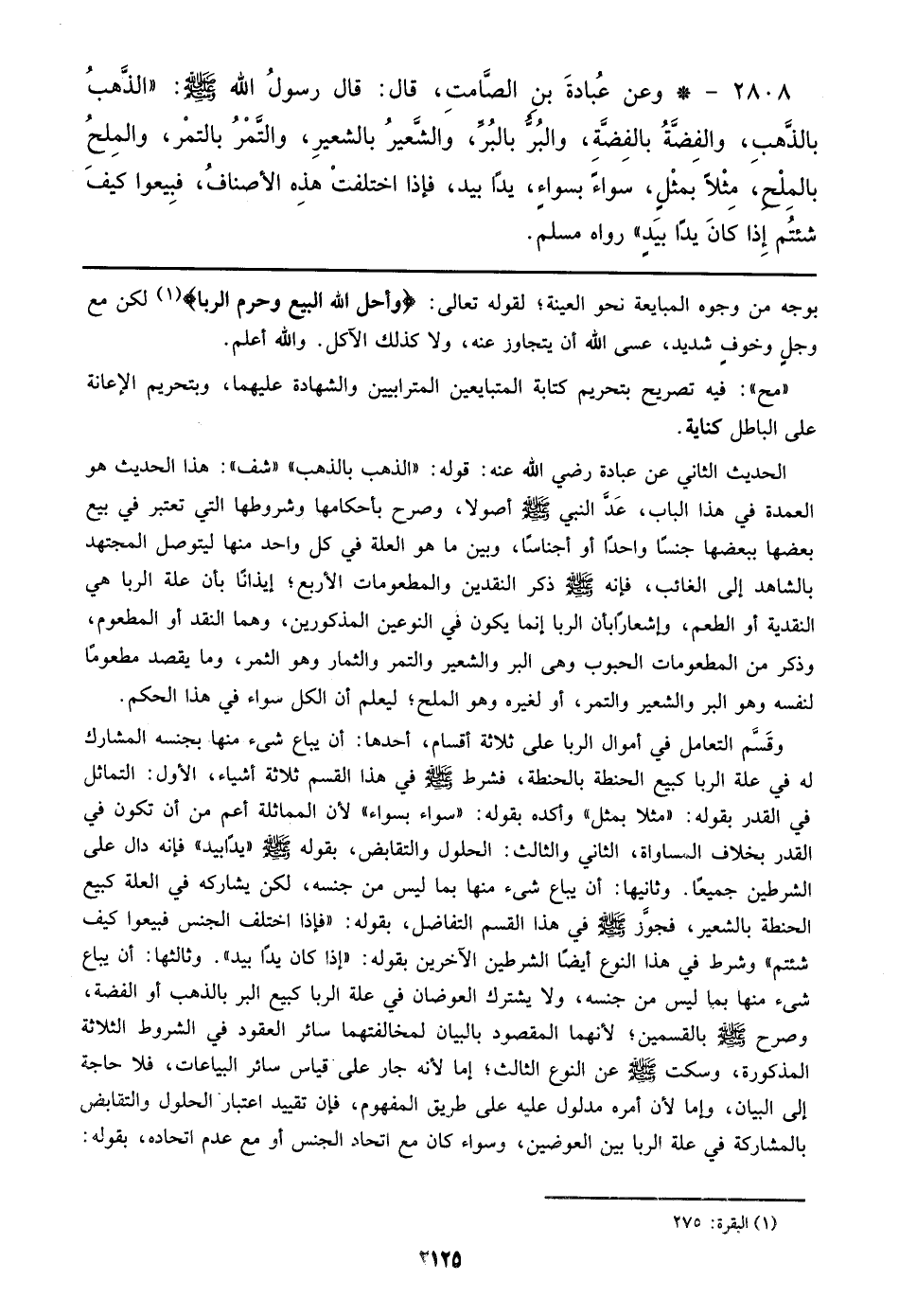 2808 - وعن عبادة بن الصامت، قال: قال رسول الله صلى الله عليه وسلم: ((الذهب بالذهب، والفضة بالفضة، والبر بالبر، والشعير بالشعير، والتمر بالتمر، والملح بالملح، مثلاً بمثلٍ، سواءً بسواءٍ، يداً بيد، فإذا اختلفت هذه الأصناف، فبيعوا كيف شئتم إذا كان يدًا بيد)) رواه مسلم.