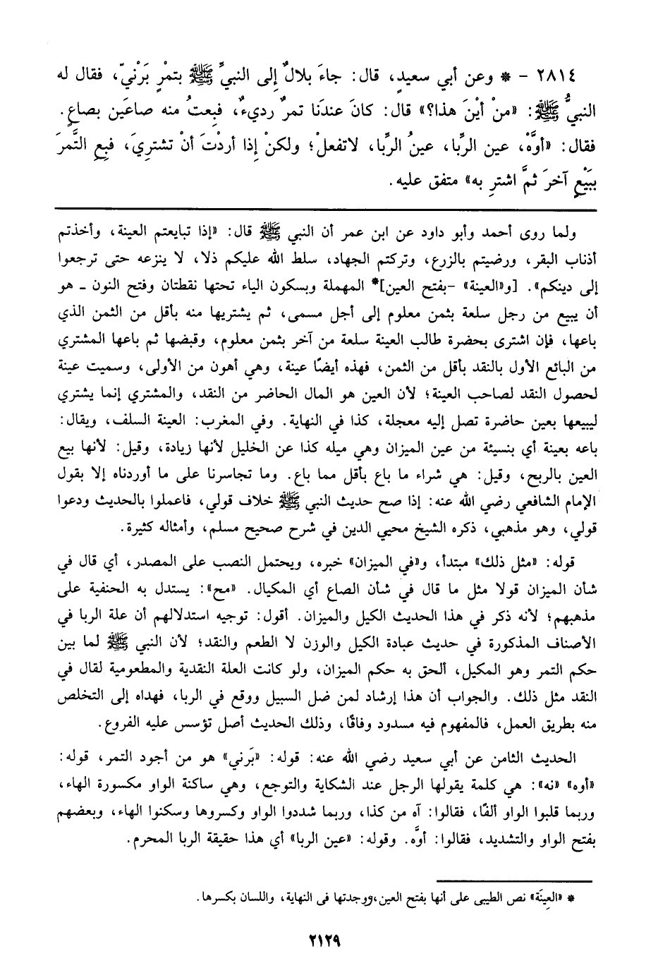 الحديث الثامن عن أبي سعيد رضي الله عنه: قوله: ((برني)) هو من أجود التمر، قوله: ((أوه)) ((نه)): هي كلمة يقولها الرجل عند الشكاية والتوجع، وهي ساكنة الواو مكسورة الهاء، وربما قلبوا الواو ألفاً، فقالوا: آه من كذا، وربما شددوا الواو وكسروها وسكنوا الهاء، وبعضهم بفتح الواو والتشديد، فقالوا: آوه. وقوله: ((عين الربا)) أي هذا حقيقة الربا المحرم.