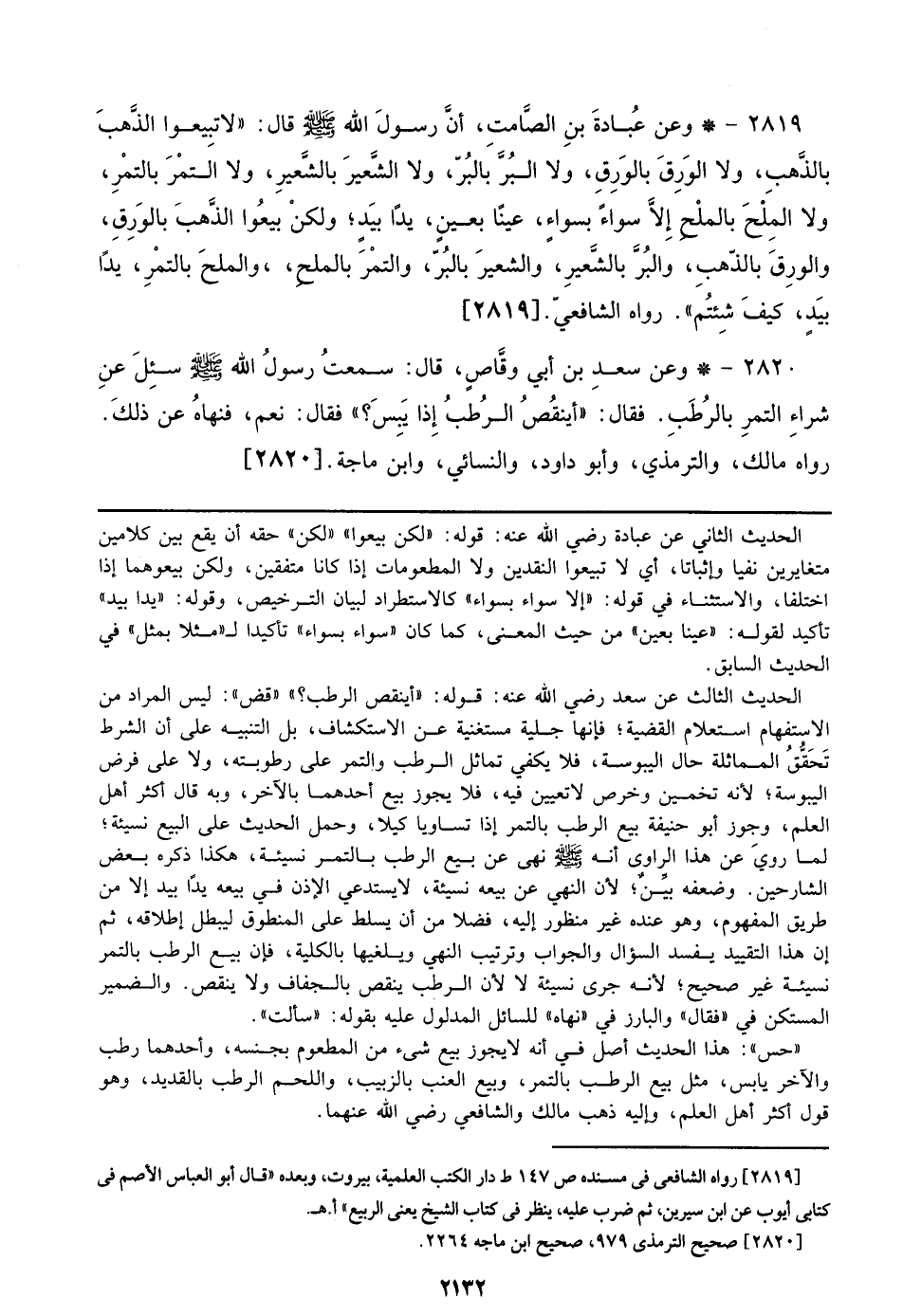2819 - وعن عبادة بن الصامت، أن رسول الله صلى الله عليه وسلم قال: ((لا تبيعوا الذهب بالذهب، ولا الورق بالورق، ولا البر بالبر، ولا الشعير بالشعير، ولا التمر بالتمر، ولا الملح بالملح إلا سواءً بسواءٍ، عيناً بعينٍ، يداً بيدٍ؛ ولكن بيعوا الذهب بالورق، والورق بالذهب، والبر بالشعير، والشعير بالبر، والتمر بالملح،،والملح بالتمر، يداً بيدٍ، كيف شئتم)). رواه الشافعي. [2819]