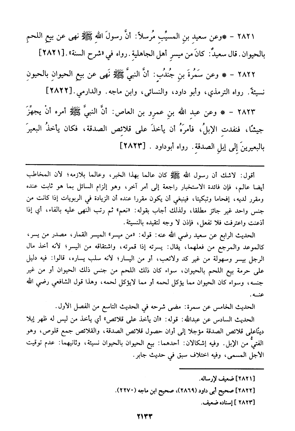 2822 - وعن سمرة بن جندب: أن النبي صلى الله عليه وسلم نهي عن بيع الحيوان بالحيون نسيئةً. رواه الترمذي، وأبو داود، والنسائي، وابن ماجه. والدارمي. [2822]