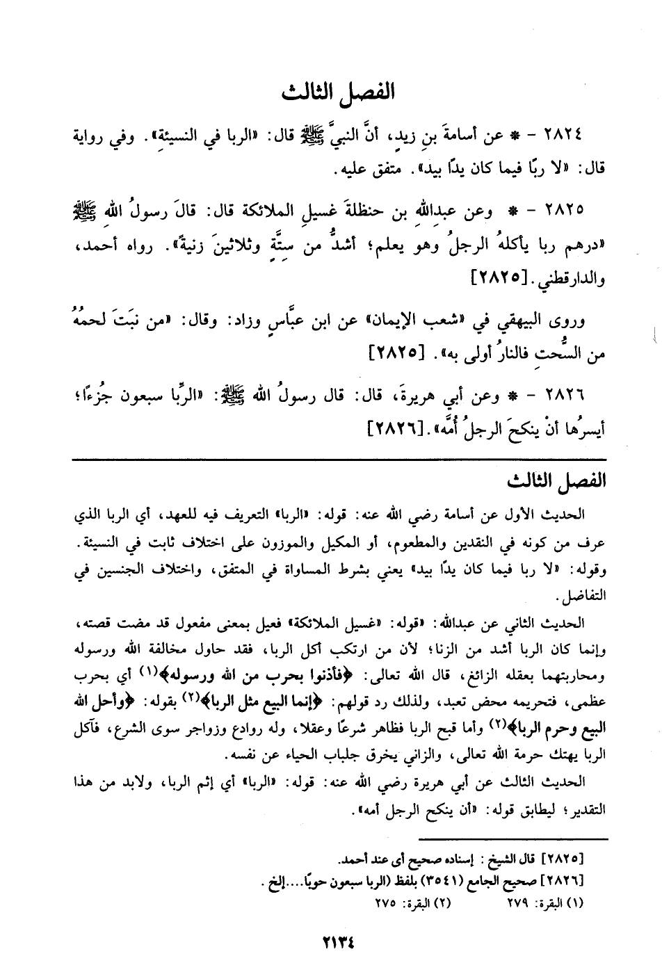 2824 - عن أسامة بن زيد، أن النبي صلى الله عليه وسلم قال: ((الربا في النسيئة)). وفي رواية قال: ((لا ربًا فيما كان يدًا بيد)). متفق عليه.