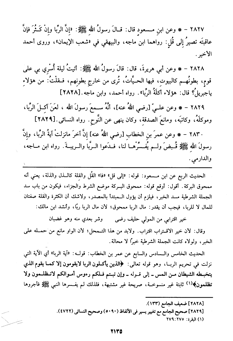 2830 - وعن عمر بن الخطاب [رضي الله عنه] إن آخر ما نزلت آية الربا، وإن رسول الله صلى الله عليه وسلم قبض ولم يفسرها لنا، فدعوا الربا والريبة. رواه ابن ماجه، والدارمي.