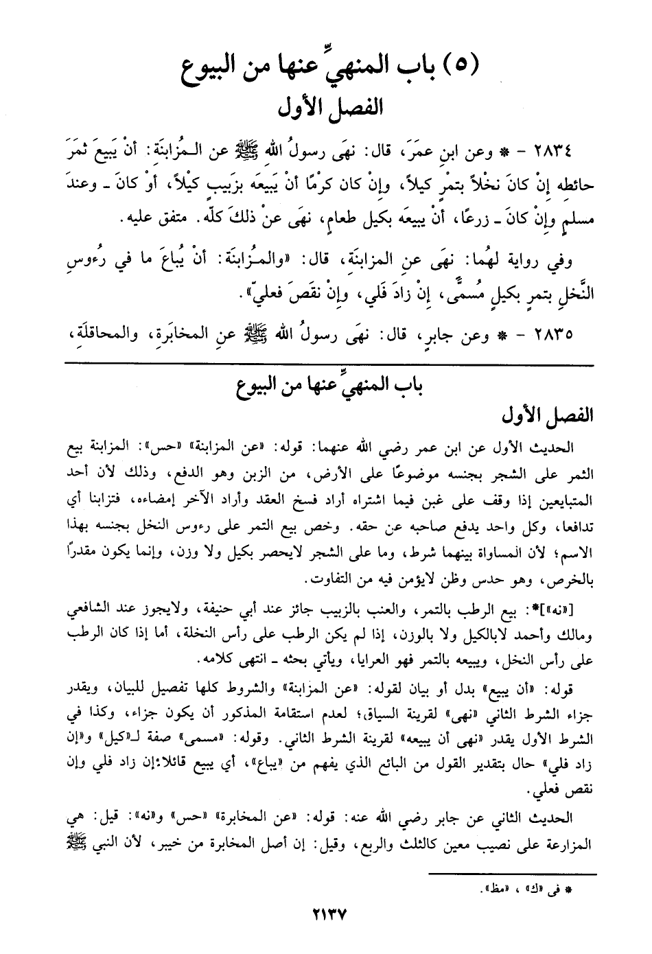 2834 - وعن ابن عمر، قال: نهي رسول الله صلى الله عليه وسلم عن المزابنة: أن يبيع ثمر حائطه إن كان نخلاً بتمرٍ كيلاً، وإن كان كرمًا أن يبيعه بزبيبٍ كيلاً، أو كان - وعند مسلمٍ وإن كان - زرعًا، أن يبيعه بكيل طعامٍ، نهي عن ذلك كله. متفق عليه.
