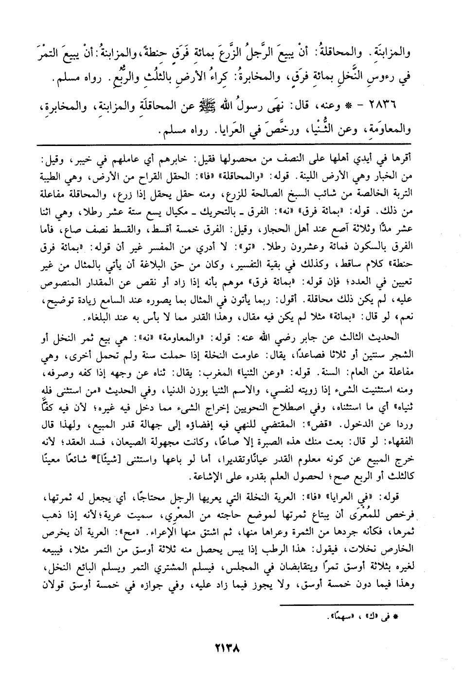 2836 - وعنه، قال: نهي رسول الله صلى الله عليه وسلم عن المحاقلة والمزابنة، والمخابرة، والمعاومة، وعن الثنيا، ورخص في العرايا. رواه مسلم.
