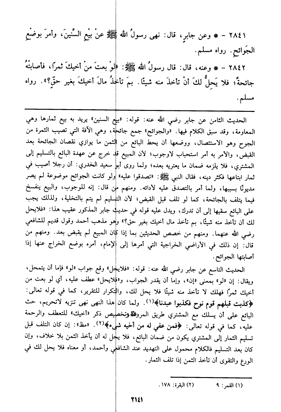 2841 - وعن جابر، قال: نهي رسول الله صلى الله عليه وسلم عن بيع السنين، وامر بوضع الجوائح. رواه مسلم.