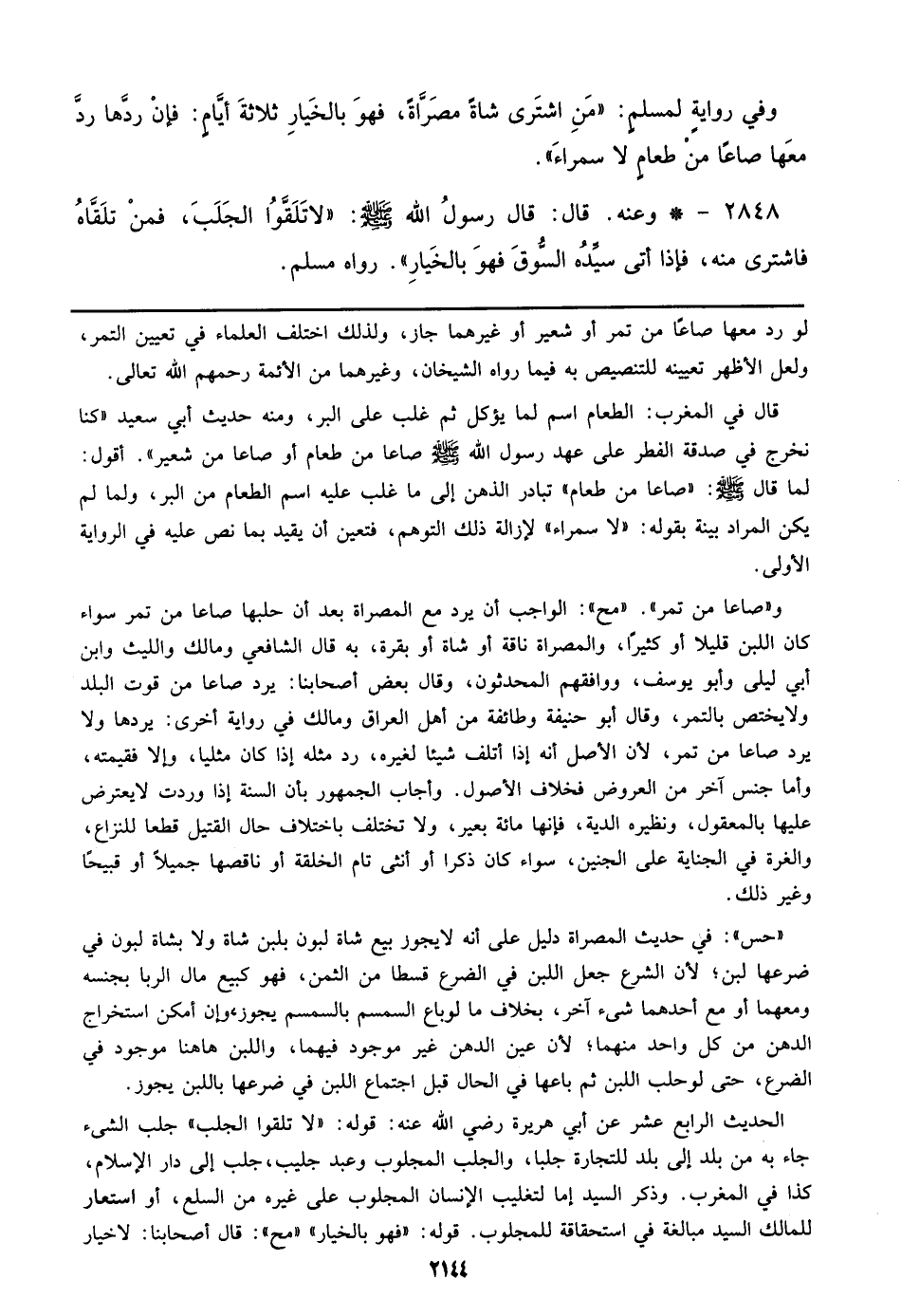الحديث الرابع عشر عن أبي هريرة رضي الله عنه: قوله: ((لا تلقوا الجلب)) جلب الشيء، جاء به من بلد إلي بلد للتجارة جلبا، والجلب المجلوب وعبد جليب، جلب إلي دار الإسلام، كذا في المغرب. وذكر السيد إما لتغليب الإنسان المجلوب علي غيره من السلع، أو استعار للمالك السيد مبالغة في استحقاقة للمجلوب. قوله: ((فهو بالخيار)) ((مح)): قال أصحابنا: لا خيار