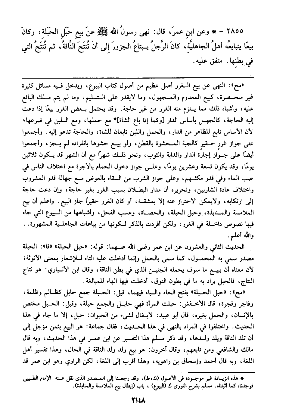 2855 - وعن ابن عمر، قال: نهي رسول الله صلى الله عليه وسلم عن بيع حبل الحبلة، وكان بيعًا يتبايعه أهل الجاهلية، كان الرجل يبتاع الجزور إلي أن تنتج الناقة، ثم تنتج التي في بطنها. متفق عليه.
