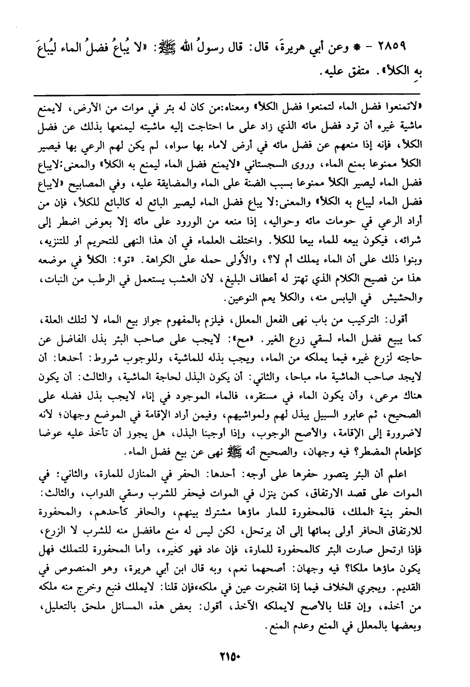 2859 - وعن أبي هريرة، قال: قال رسول الله صلى الله عليه وسلم: ((لا يباع فضل الماء ليباع به الكلأ)). متفق عليه.
